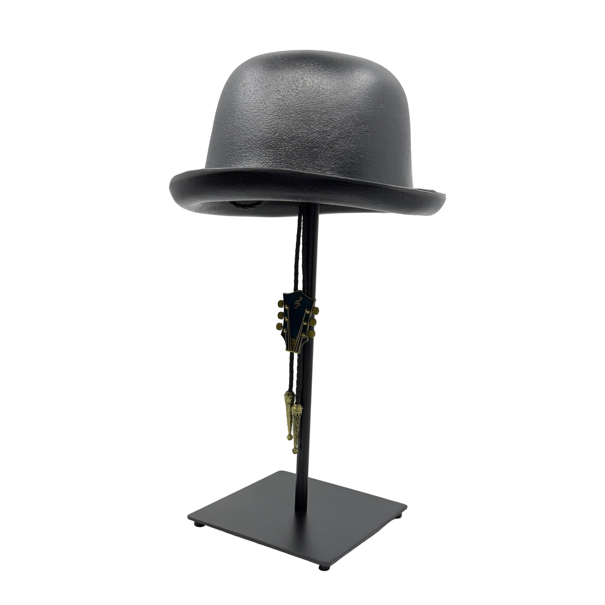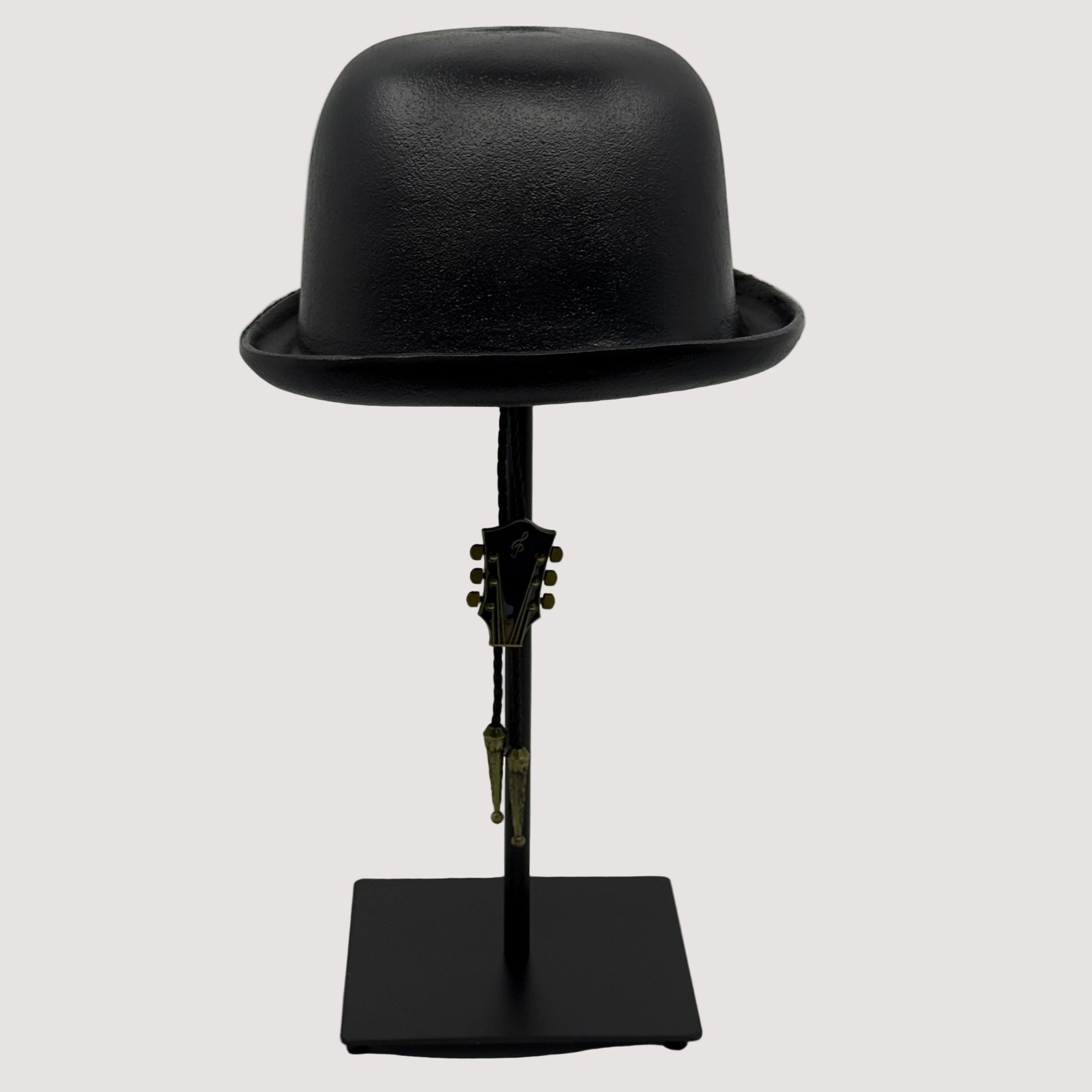 Meticulously handcrafted by Evan Ryans, this bowl hat, fashioned from metal and steel, is presented on a sculpture stand that highlights its industrial heritage. Renowned for its elegant matte black finish, it exemplifies refined craftsmanship and timeless appeal.